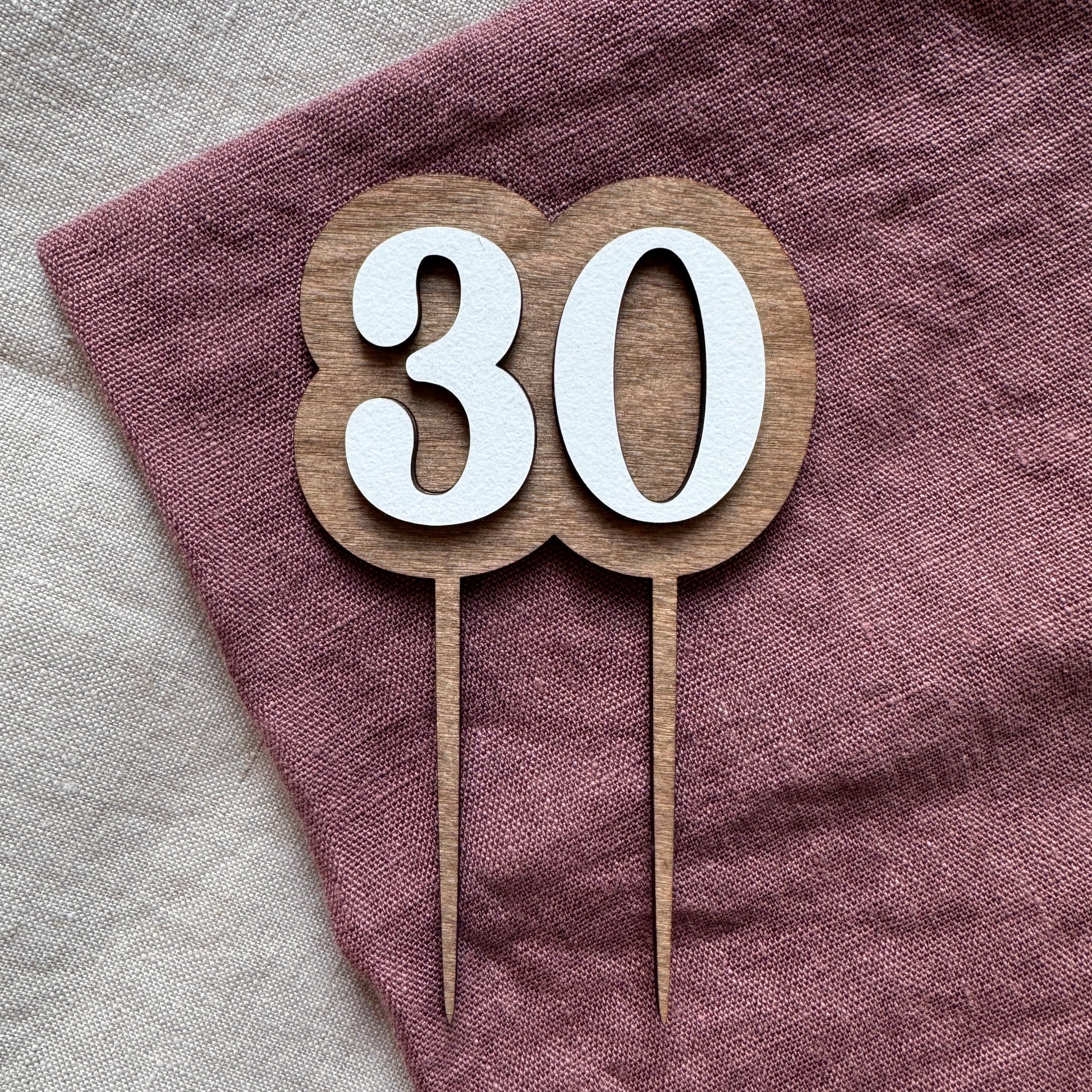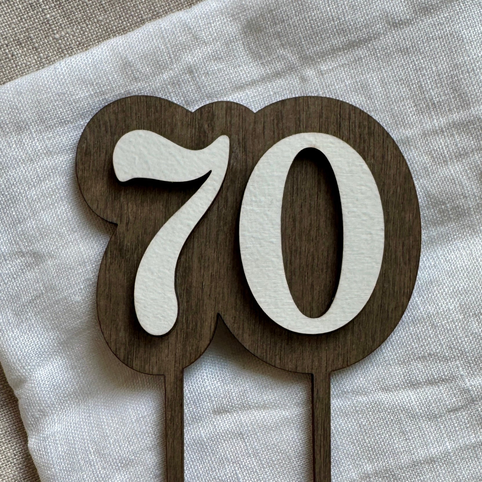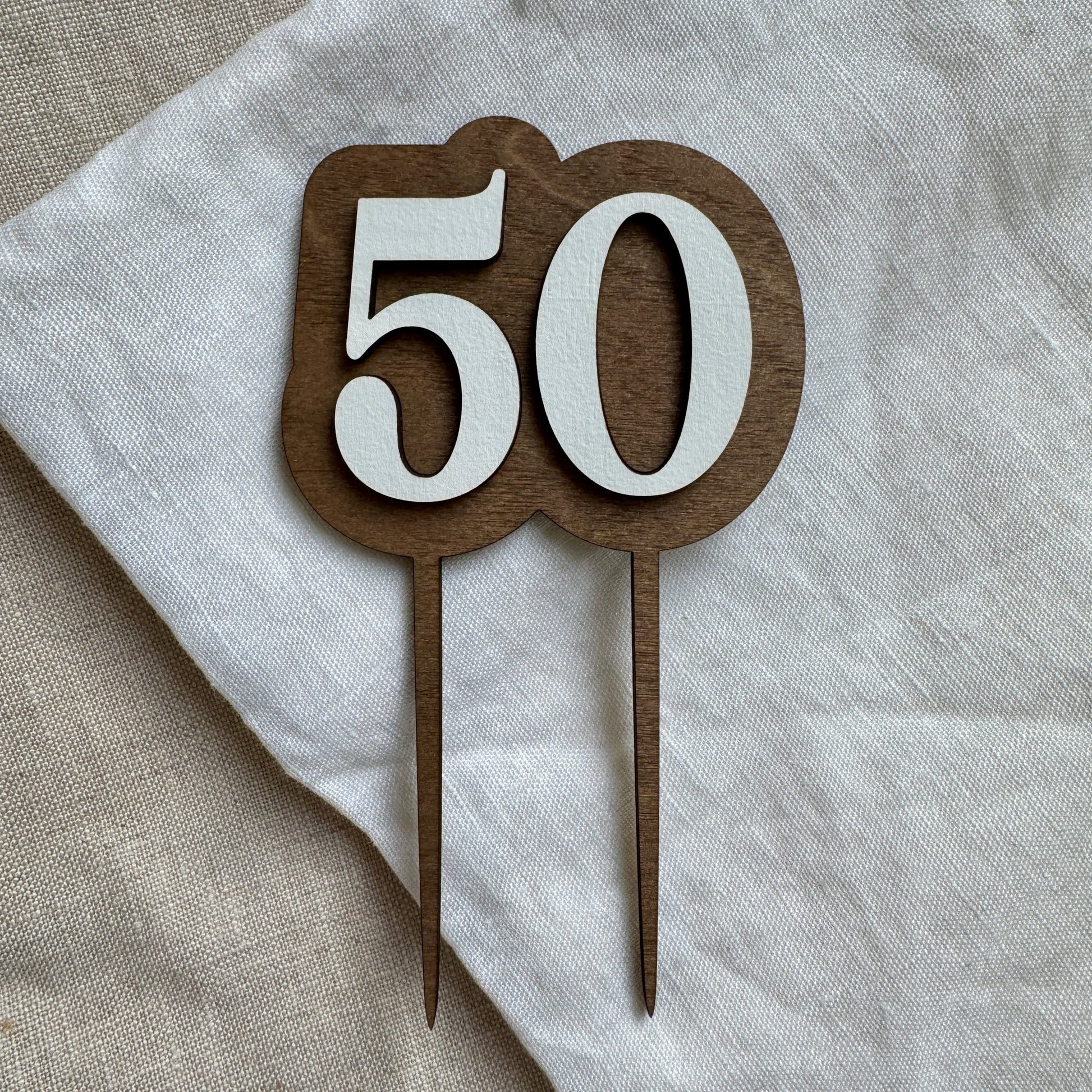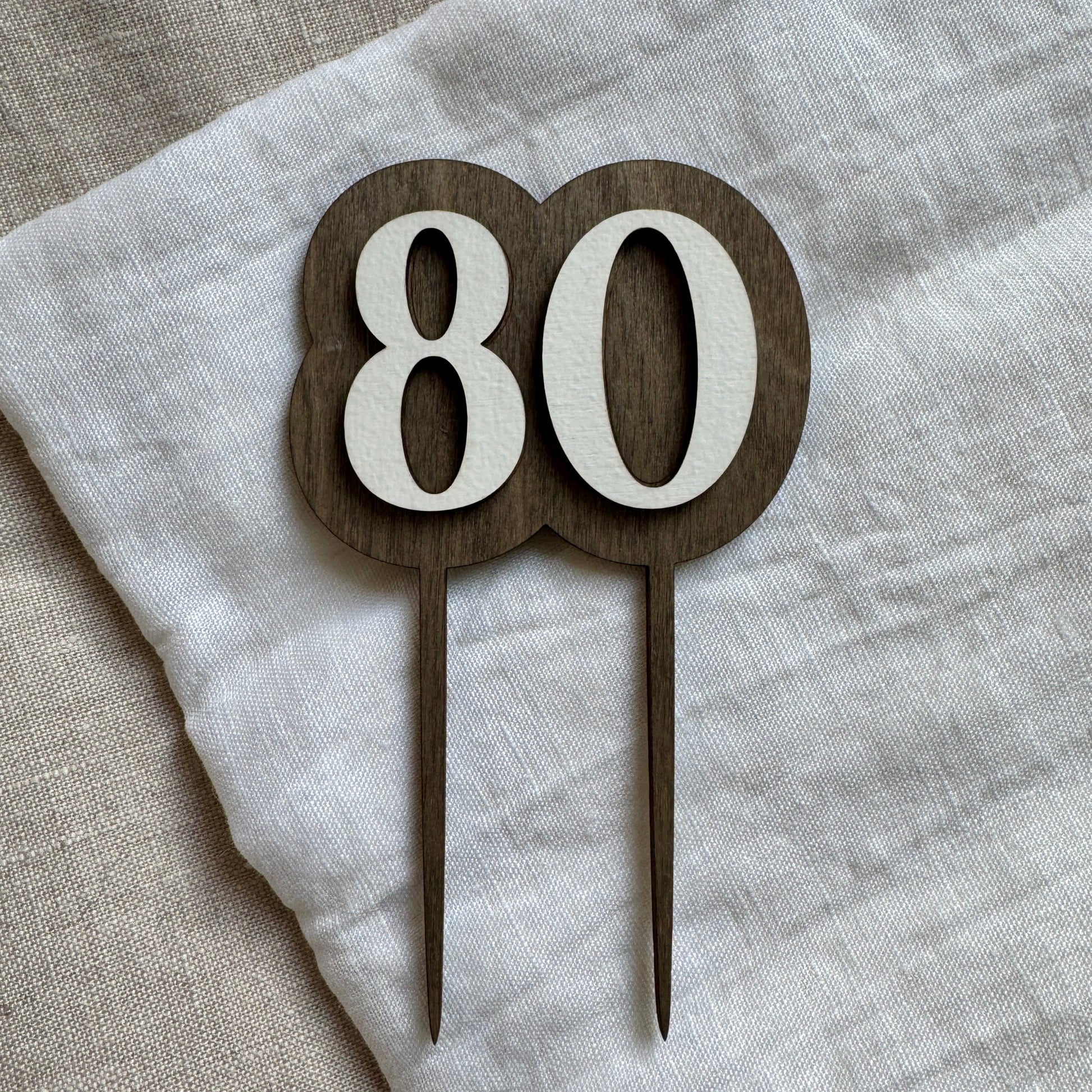 Kaketopper i tre. Kaketopperen er laget i to lag 3mm bjørkefiner. En bakplate med føtter som går ned i kaken og ett lag med tall som er limt på bakplaten.