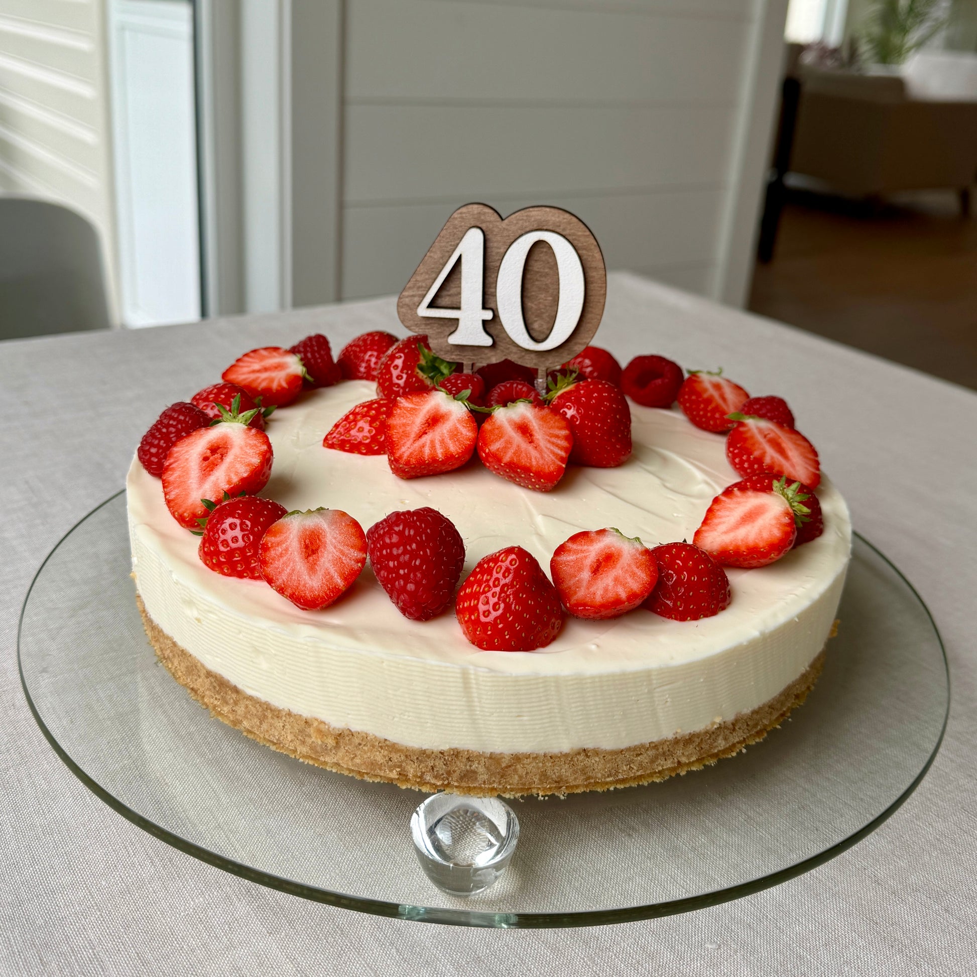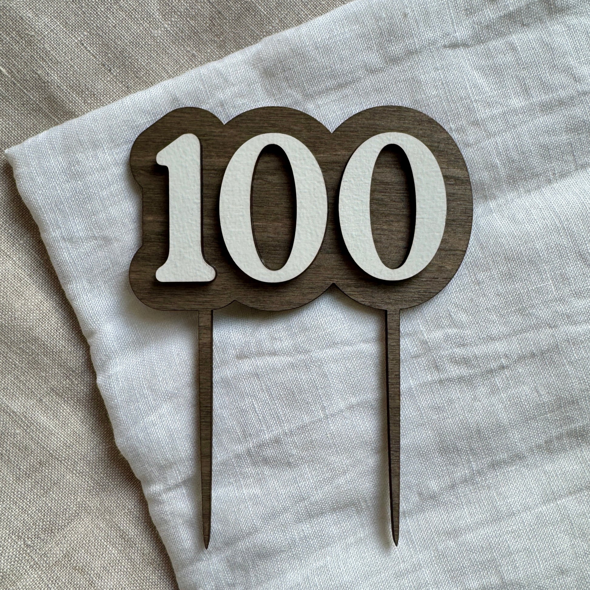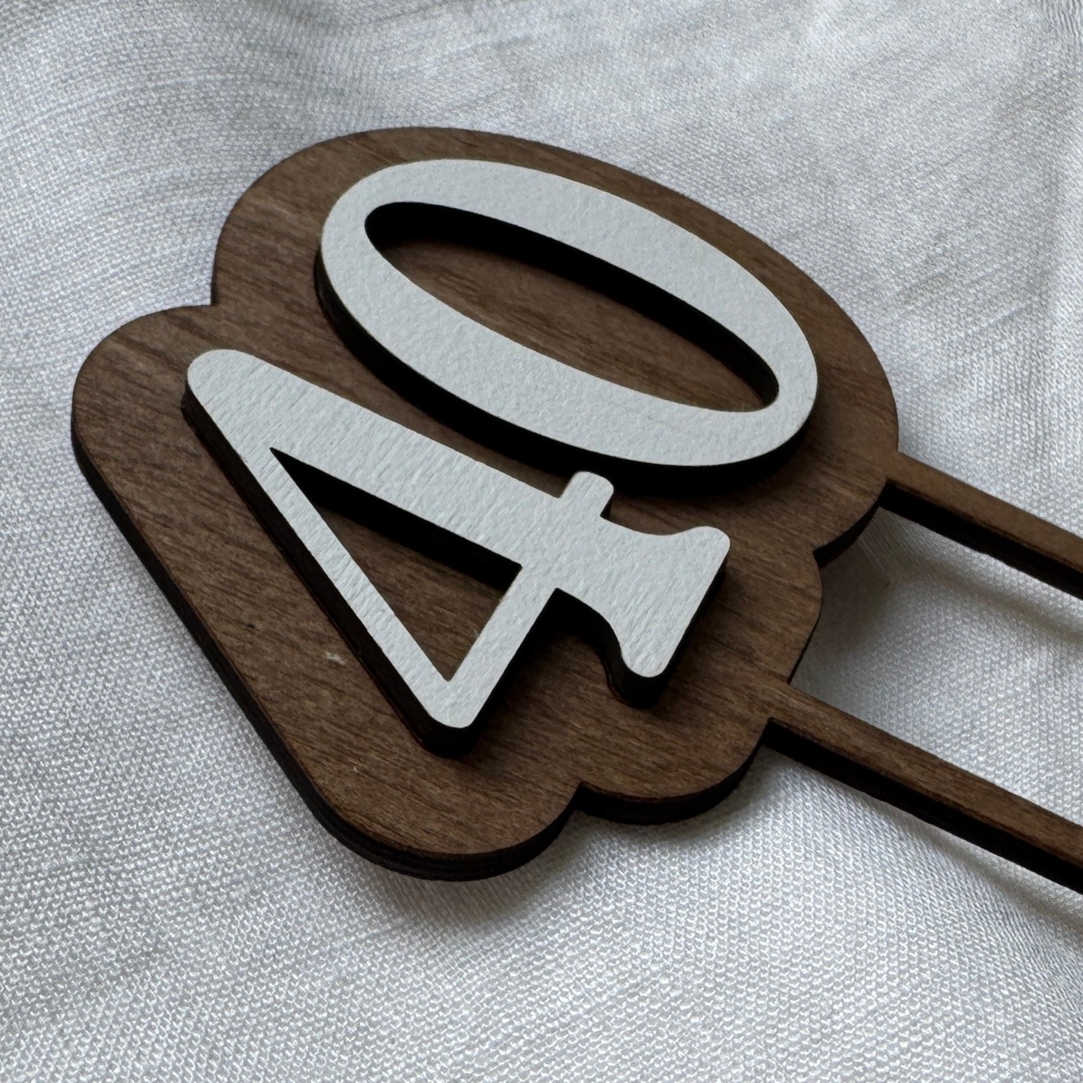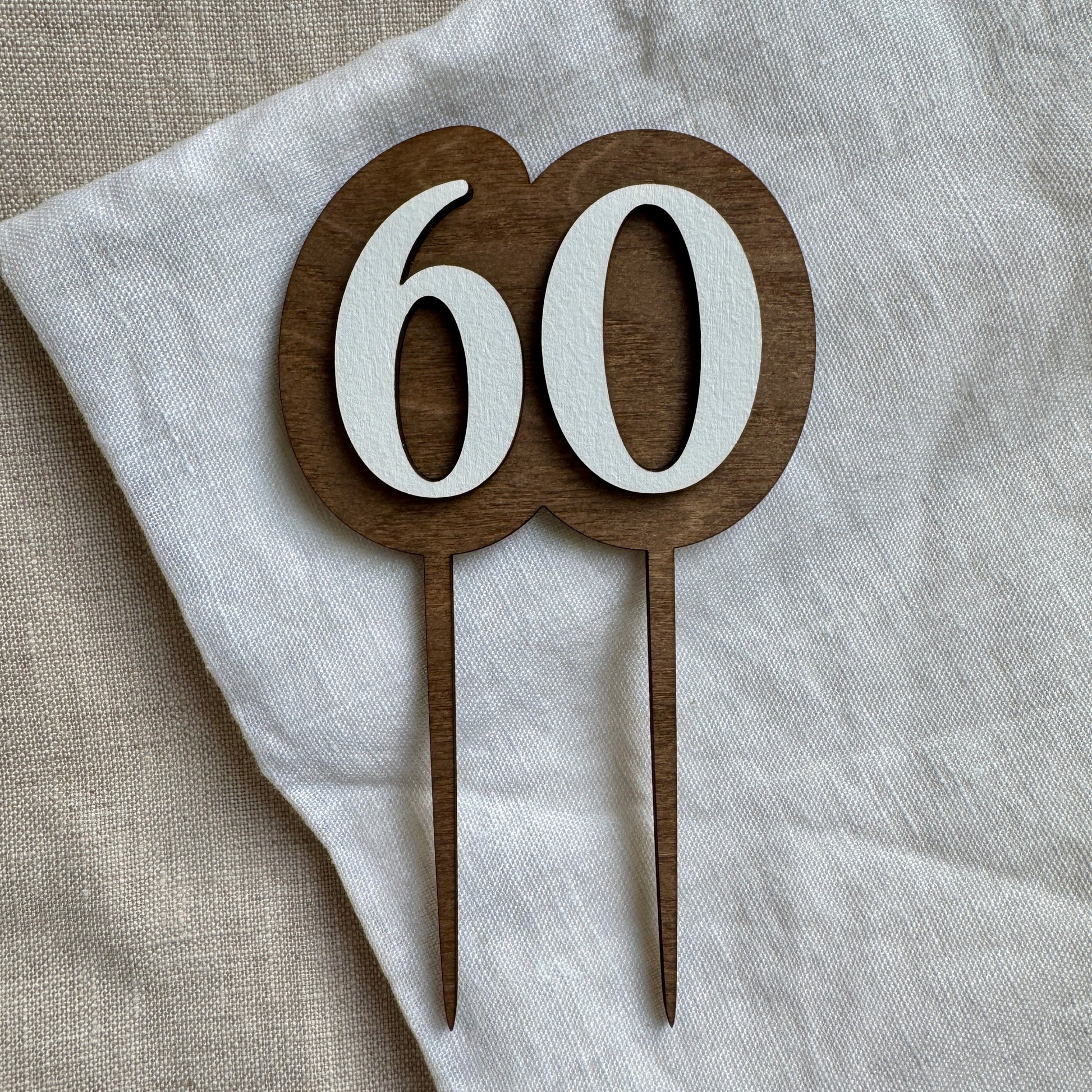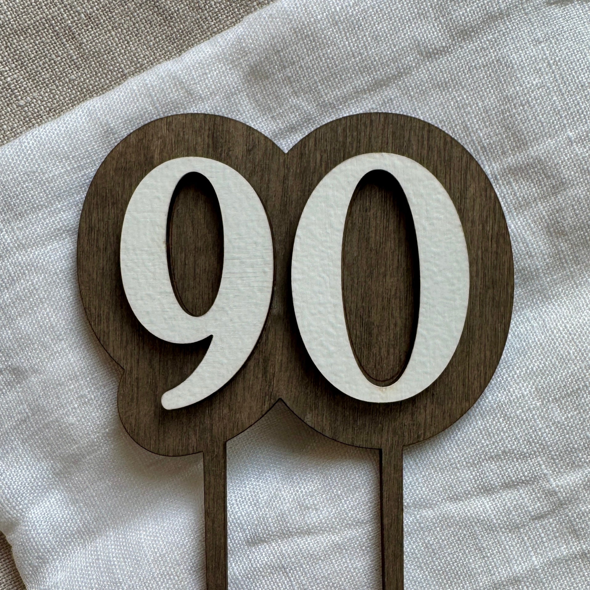 Kaketopper i tre. Kaketopperen er laget i to lag 3mm bjørkefiner. En bakplate med føtter som går ned i kaken og ett lag med tall som er limt på bakplaten.